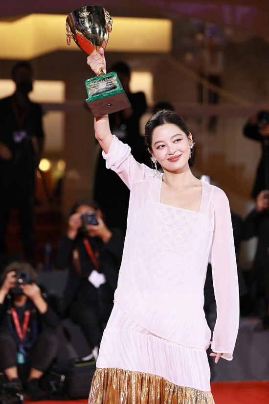 从《如懿传》中心机深沉的金玉妍,到《长江图》中神秘的安陆,再到《日掛中天》中深陷困境的美云,她在不同角色中穿梭,用克制而充满张力的表演征服观众,导演蔡尚君评价她“不是在演角色,而是成为了角色”。2025年,她凭借《日掛中天》斩获威尼斯影后,站在世界级舞台上哽咽着对母亲说“妈妈,你看”,当年的狂言,终成现实。