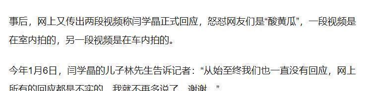 不过她的儿子很快就出来澄清,说网上所有的回应都是假的。而且有媒体去查验了,那段酸黄瓜的视频,是以前的旧视频。所以从这件事来看,她确实是被造谣了。而宋晓峰他们也是真的冤,什么也没做,就因为和闫学晶是圈内好友,同为二人转演员出身,就成了大家情绪宣泄的代偿品。